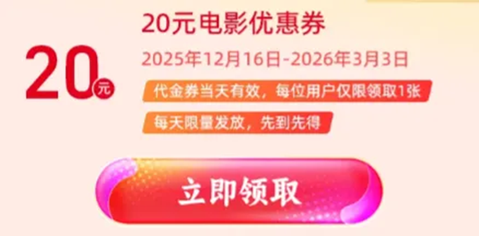 2026“MOVIE生活新年嘉年华”已经正式启幕,活动自2025年12月16日起至2026年3月3日,每日上午10时通过淘票票App、支付宝淘票票小程序准时发放“立减20元电影消费券”(单张影票满30元可用),同时投放不少于100万份随机金额观影红包。
