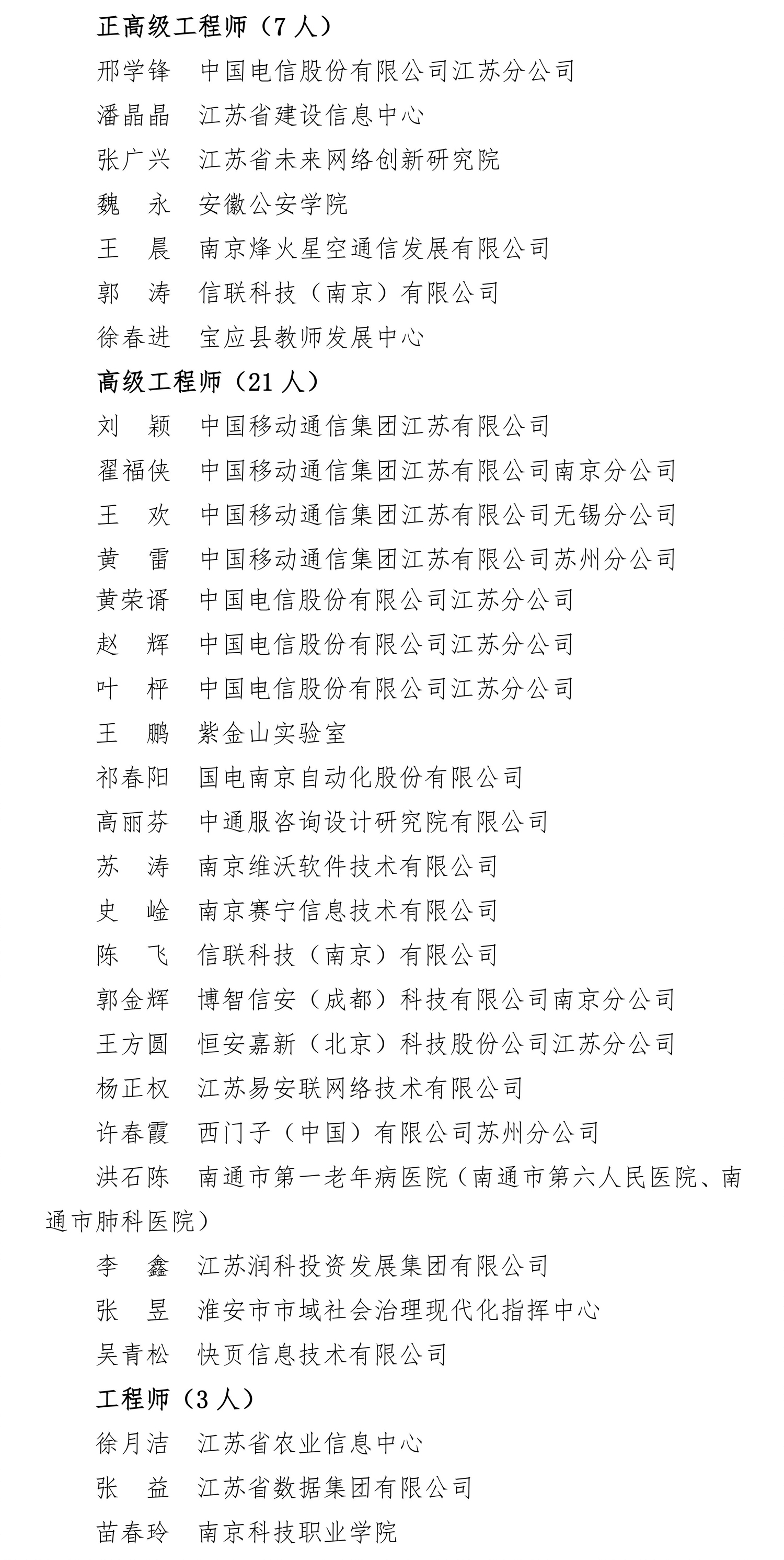经2025年度江苏省数字经济(网络安全)工程高级专业技术资格评审委员会评审,邢学锋等7人具备正高级工程师资格、刘颖等21人具备高级工程师资格;省本级申报人员中,徐月洁等3人具备工程师资格。