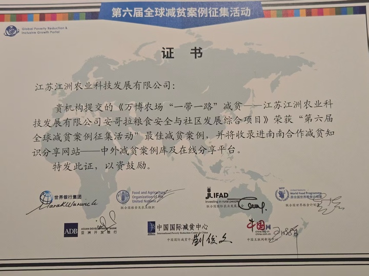 12月11日,在中国国际减贫中心、联合国粮食及农业组织等联合举办的2025全球减贫伙伴研讨会上,《万博农场“一带一路”减贫——江苏江洲农业科技有限公司安哥拉粮食安全与社区发展综合项目》荣获第六届“全球减贫案例征集活动”最佳案例,也是获奖名单中唯一由江苏企业独自申报的案例。