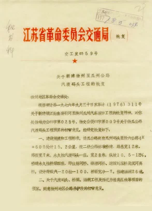 这是一份由江苏省革命委员会交通局在1977年8月23日签发的批复,对“扬瓜公路汽渡码头工程预算的初审意见”,研究后做出批复,从建设规模和工程标准、预算、核定经费、节省费用四个方面提出要求。要求“本工程要贯彻自力更生、艰苦奋斗、勤俭节约的精神,所需的石料及石灰尽可能采取就地、就近采运,压缩造价节省费用。”