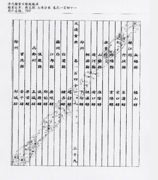 在这份雍正朝的大清会典中,标注了江苏的几个地名,如镇江府、淮安府、扬州府等,而在扬州府中,又有江都县、仪征县、高邮州、宝应县,其中标明了各处驿站,有广陵驿、邵伯驿、仪征驿、盂城驿、界首驿,这些驿站的名称都是当时的交通要点,可见邵伯就处在交通要道上。