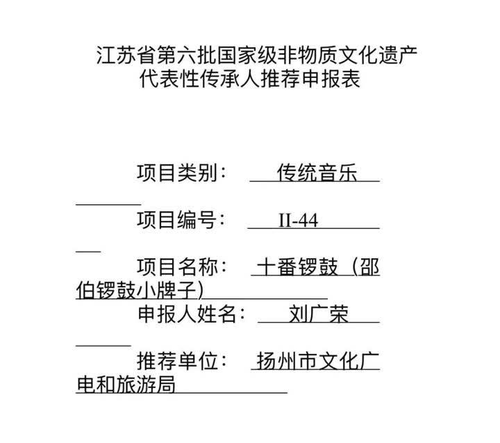 刘广荣,邵伯锣鼓小牌子项目国家级非遗传承人。从这份申报表中,可以看出他的人生经历:在邵伯读私塾、小学、初中毕业。曾插队在邵伯南渡村劳动,并从事打击乐演练、研究。此后,进入江都电表厂工作,利用业余时间和节假日参与从事打击乐演练、研究。特别是1998年至2000年之间,邵伯锣鼓小牌子队伍筹备到2000年正式成立,有很多时间参与活动。2001年至今,参加历届中国·邵伯湖旅游龙虾节开幕式、闭幕式文艺活动。2011年退休后,依然发挥光和热。至今,参与各级活动数十次;多次参与接待国内外友人和各级党政团体演出。