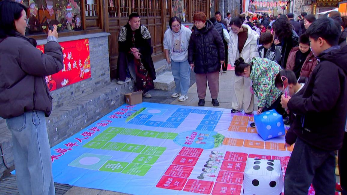 古风投壶、趣味套圈、年画拓印等传统民俗游戏备受亲子家庭青睐。大家在欢声笑语中体验民俗魅力,感受市井烟火气。活动现场还特别设置了“抵制校园暴力跳格子”“法律知识拼图”“普法答题闯关”等互动环节,以轻松有趣的形式,引导未成年人增强法治观念,提升自我保护意识。“我们今天玩得很开心,体验了许多有趣的游戏,还学到了在学校里不能随便欺负别人,也不能随便被别人欺负的道理。”小朋友王思清高兴地说。