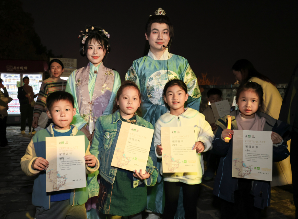 活动最后,孩子们在灯笼光影中拍摄了大合影,并领取了“小小知世郎”证书。主办方表示,未来将继续探索更多夜间文化体验场景,为市民和游客带来更多的金陵文化体验。