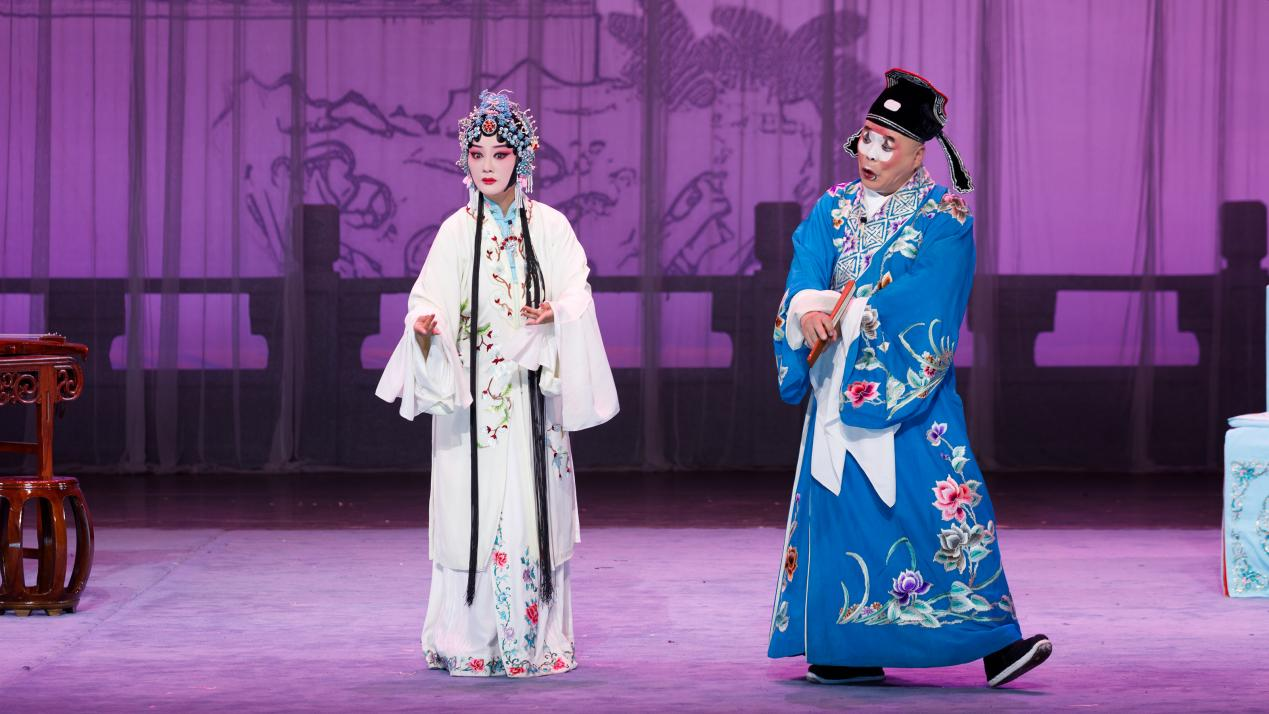 此次演出在舞台呈现上暗藏“年轻化小心思”:“一桌两椅”的写意传统之余,随剧情切换的背景与灯光营造出渐递式的视觉效果。新增的游园赏花桥段中,演员水袖轻扬、眉眼流转,兼具传统端庄与少女灵动。“帘试”一场的珠帘既是分割舞台空间的写意符号,更暗含“冲破帷幕见真心”的现代表达,成为传统与现代对话的生动诠释。
