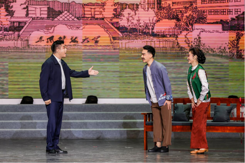 黄梅小戏《谁请客》既保留黄梅戏“曲调婉转、口语化强”的本色,又融入现代舞台元素,用传统“花腔”演绎村民议论的热闹场景,以抒情“平词”刻画创业者的家国情怀,让乡音更具辨识度;舞台上,以现代光影烘托“请客”温情,以冷光暗示争执紧张,视觉语言与剧情深度契合。