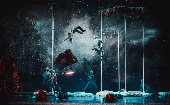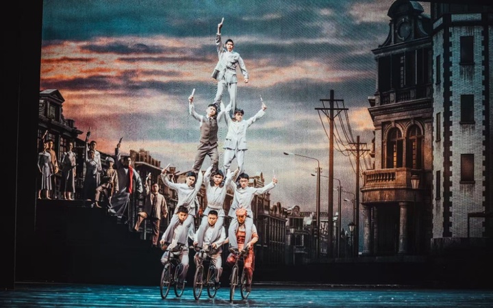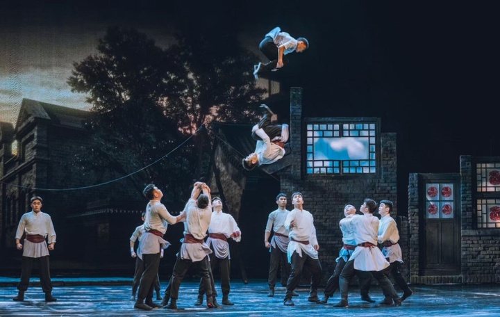 在艺术呈现上,《先声》打破了传统杂技单纯追求技巧展示的局限,将舞狮、高跷、腾空飞杠、爬杆、软钢丝、高椅、车技、网吊、钻圈等30余个精品杂技节目与剧情深度绑定,更创新编排了《摩托飞车》《高空网吊》等定制节目。《集体爬杆》中以演员挺拔向上的姿态再现抗日战士冲锋陷阵的壮烈;《高空网吊》借肢体柔术技巧传递家园沦陷的悲怆与对信仰的坚守;《集体车技》则用疾驰车轮隐喻救亡图存的急迫。每一项技艺都不再是孤立的技巧展示,而是推动剧情、传递情感的“叙事语言”,实现了“技”与“情”的统一。