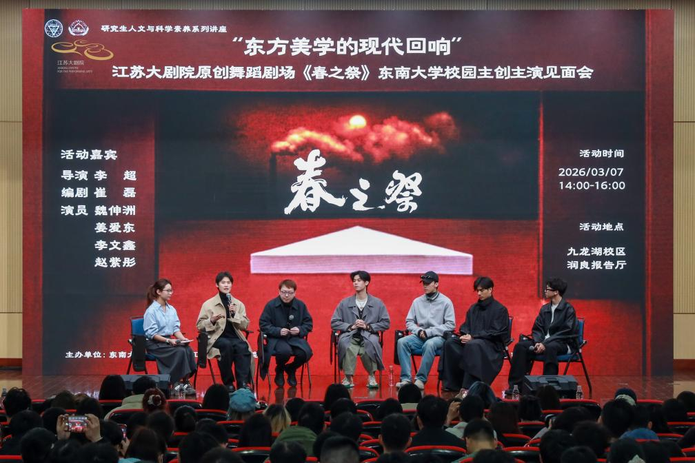 3月7日下午,《春之祭》走进东南大学九龙湖校区,举行《东方美学的现代回响——江苏大剧院原创舞蹈剧场〈春之祭〉东南大学校园主创主演见面会》,导演李超、编剧崔磊及四位主演魏伸洲、姜爱东、李文鑫、赵紫彤与数百名学子展开深度对话。交流现场,主创主演分享了创作历程与表演感悟:导演李超分享了创作初衷,他表示《春之祭》最打动他的是跨越时代的生命体察,无论外部环境如何变化,最终都要回归创作者的精神原乡,这也是整部作品想要传递的东方表达内核;编剧崔磊与学子探讨“在不确定的外部世界中找到内心安放位置”的人生选择;主演们现场展示剧中标志性动作,阐释如何通过武术发力方式实现东方美学的肢体表达,如何摒弃传统舞剧对“美感”的刻意追求,以真实的情绪传递塑造有血有肉的艺术先驱。