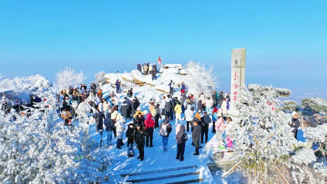 景区精心组织摄影爱好者们登上花果山之巅——玉女峰,在银装素裹的冰雪世界中,用镜头定格雾凇凝霜、云海奔涌的壮美画卷,记录下冬日山峦被晨光镀上金边的珍贵瞬间。一位摄影爱好者兴奋地说道:“这雾凇真的是太美了,把整个山峦装点成冰雪世界,真是太出片了。”