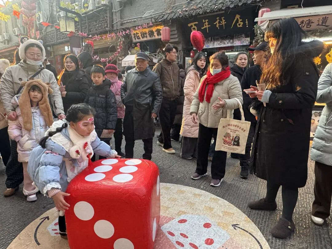 “石头剪刀布……”在“三碗不过冈”游戏摊位上,市民游客们排着长队等待猜拳,古装NPC和游客热情互动,“恭喜你,来,拿走银票。”一旁的掷骰子和蔬果套圈圈挑战现场,早已被孩子们围得水泄不通,孩子们小手紧紧攥着银票,眼神里满是跃跃欲试的期待。