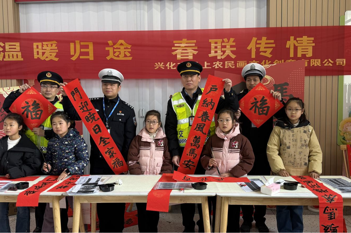 活动现场,大红的宣纸、饱满的墨汁整齐摆放,来自兴化的十余位书法爱好者齐聚一堂,挥毫泼墨,为过往司乘人员和当地村民书写春联与“福”字。“骏马奔腾辞旧岁,灵羊开泰迎新春”“马跃前程去,羊携好运来”“一帆风顺吉星到,万事如意福临门”……一幅幅充满马年特色的春联跃然纸上,既有对新年的美好期许,也饱含着对家国平安的深切祝福。过往司乘人员纷纷驻足围观,不少人主动上前索要春联。“马上就过年了,能拿到书法家手写的春联,感觉比买的更有意义,这墨香里的年味才地道!”一位来自苏州的货车司机拿着刚写好的春联,脸上洋溢着喜悦。志愿者们还贴心地为大家准备了封装袋,方便大家将春联带回家。