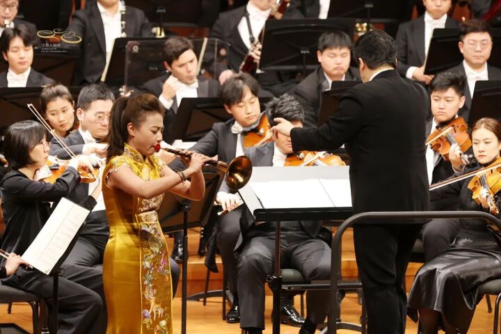 本场演出以李劭晟的《无锡组曲》开始,弦乐织体温润流动,旋律线条轻柔而富有江南气韵,迅速将听众带入含蓄隽永的审美氛围。交响组曲的首乐章《梦天》以优美的弦乐织体开篇,打击乐点缀并勾勒出航天梦想的萌芽,乐队以渐强的力度与层层推进的和声构筑出梦的轮廓,使听者感受到从幻想到启程的内在张力。第二乐章是为唢呐和管弦乐队而作的《问天》,作品转入雄壮的铜管与打击乐音响,与唢呐的声音特性完美配合,乐曲节奏鲜明,富有动力性;唢呐高亢嘹亮、极具穿透力的音色特点渲染出中华民族与自然灾害抗争的不屈意志,也象征中国航天人以科学精神探索未知的奋斗历程。