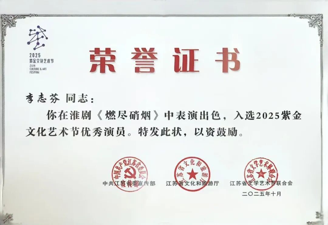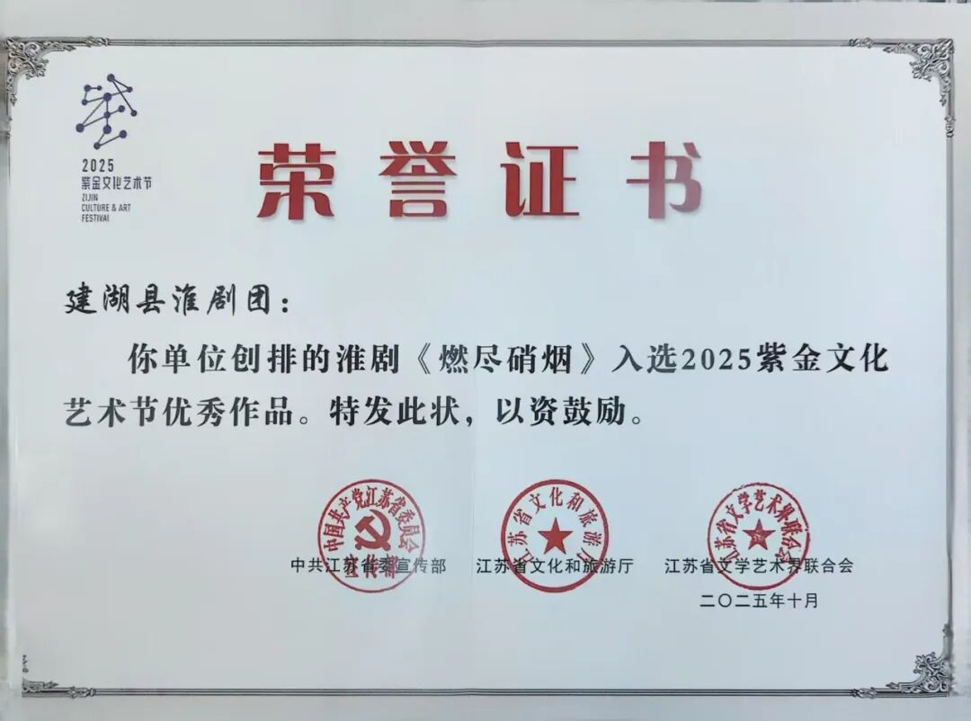 交汇点讯 10月28日,2025紫金文化艺术节表彰名单在南京揭晓,建湖县淮剧团创演的现代淮剧《燃尽硝烟》凭借深刻的精神内涵与扎实的艺术功底,荣获紫金文化艺术节最高奖“优秀剧目奖”,剧中饰演王志芳的李志芬同志获得“优秀演员奖”。