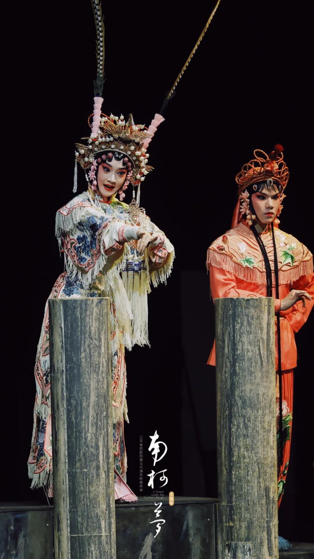 舞台上的一桌一椅、一木一桩皆浸透古意,灯光流转间,恍若踏入千年梦境。通过木桩的排列与光影的巧妙运用,营造出如梦如幻的视觉效果。演员们水袖翻飞,眉眼传神,将蚁国宦海的荣辱悲欢演绎得淋漓尽致。淳于棼的饰演者,使人物的懵懂爱财到顿悟成佛的变化展现的淋漓尽致,情绪层层递进,令人动容。而瑶芳公主的饰演者,更是将角色演绎得入木三分。她身段婉约如柳,唱腔清越似泉,一颦一笑间,尽显昆曲的雅致风华。演员们以青春的面庞,诠释着古老的剧情,让观众在欣赏传统技艺的同时,也能感受到青春的活力与朝气。