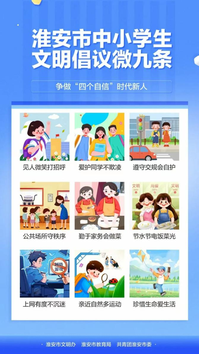 一个倡议反响热烈。创新出台《淮安市中小学生文明倡议微九条》,策划制作推出系列宣传海报和微视频,并在全市“六一”儿童节活动现场发布。部署开展“践行《文明倡议微九条》 争做‘四个自信’时代新人”主题教育活动,促进全市中小学生提升文明素养、加强道德养成。截至目前,累计获评全国“新时代好少年”3人、“新时代江苏好少年”27人。