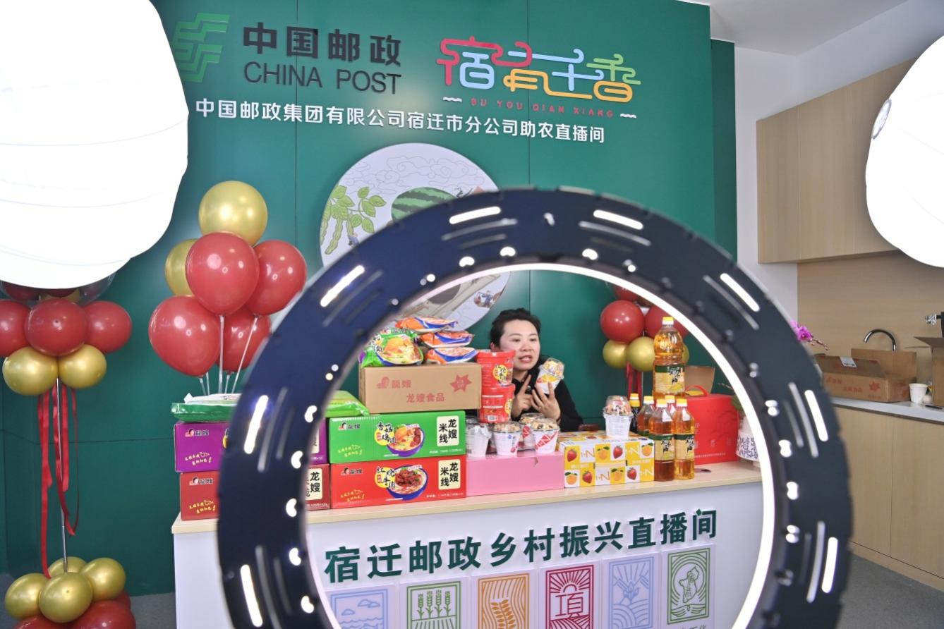 邮政主播在综合服务乡村振兴服务中心为宿迁本地农特产品直播销售