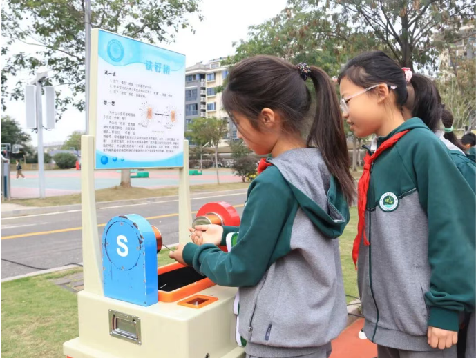 三年级的同学围在“跳舞回形针”展项前,瞪大眼睛看着回形针随音乐节奏上下跳动,好奇的小脑袋里满是疑问;四年级的同学在“脉搏波血压计”前排起长队,认真按步骤测量血压,还兴奋地和同伴分享“我的血压值很正常”;五年级的同学对着“窥视无穷”展项入了迷,转动手轮看着镜中无尽延伸的彩灯,忍不住追着老师问“这到底是怎么做到的”;六年级的同学则挑战起“拓扑”玩具,专注地尝试在不解开绳子的情况下将其从构架中取出,专注模样格外动人。