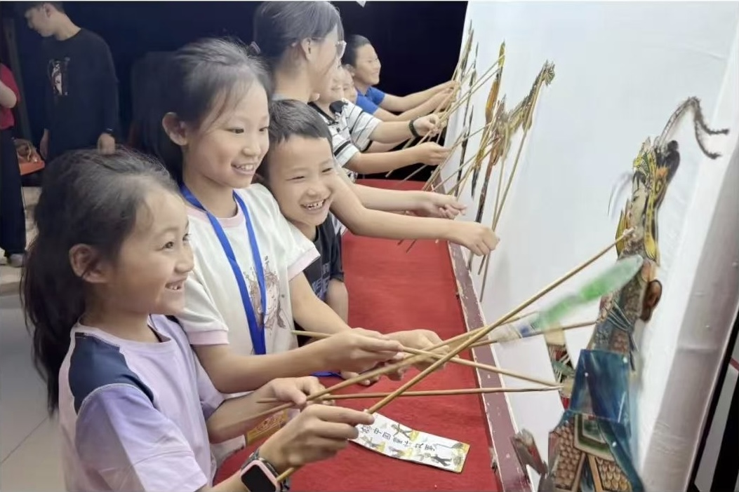 小记者们在艺术团老师的指导下,体验非物质文化遗产——皮影戏。童稚的手指牵引着古老的皮影,传统技艺的种子在亲身体验中悄然播撒。