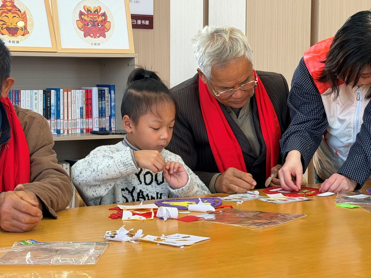 在“手工贴画互动”环节,孩子们与社区的爷爷奶奶结成“忘年交”,共同参与手工贴画互动。过程中,这些孩子不再是简单的学习者,更是爷爷奶奶的小助手——热情地帮助老人分发材料,用稚嫩的小手与爷爷奶奶们一同裁剪、粘贴,协力完成一幅幅寓意吉祥的菊花、寿桃贴画。其乐融融的景象不仅传递出节日温情,更让孩子们在实践中体会到陪伴与付出的快乐。