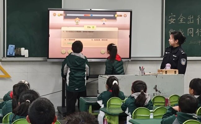 活动中民警为孩子们带来一堂生动的“交通安全解码课”,从禁令标志、警告标志,到各类信号灯的识别,借助趣味图文将抽象的交通规则转化为孩子们易懂的“安全密码”。随后进行的“头盔安全硬核科普”环节,更是结合真实数据与科学原理,深入浅出地讲解了头盔的防护机制。“半球形设计如何分散冲击力?”“内衬又是怎样起到缓冲作用的?”——科学的解答让“佩戴头盔就是守护生命”的理念深入童心。在气氛热烈的“互动竞答”中,学生们热情高涨,积极抢答“多少岁可坐副驾驶?”“全国中小学生安全教育日是哪天?”等问题,在欢声笑语中将安全知识牢牢铭记。