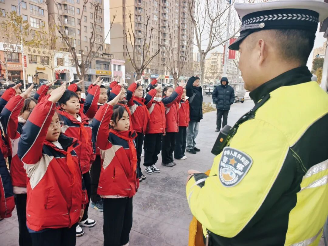 在老师的带领下,学生代表郑重地向交警大队九中队的护学岗送上了印有“九中队交警护学保平安,红领巾队员向警学榜样”的锦旗,鲜红的锦旗映照着交警叔叔挺拔的身影,也定格了少年们致敬英雄的真诚瞬间,让寒冷的冬日充满了温暖。
