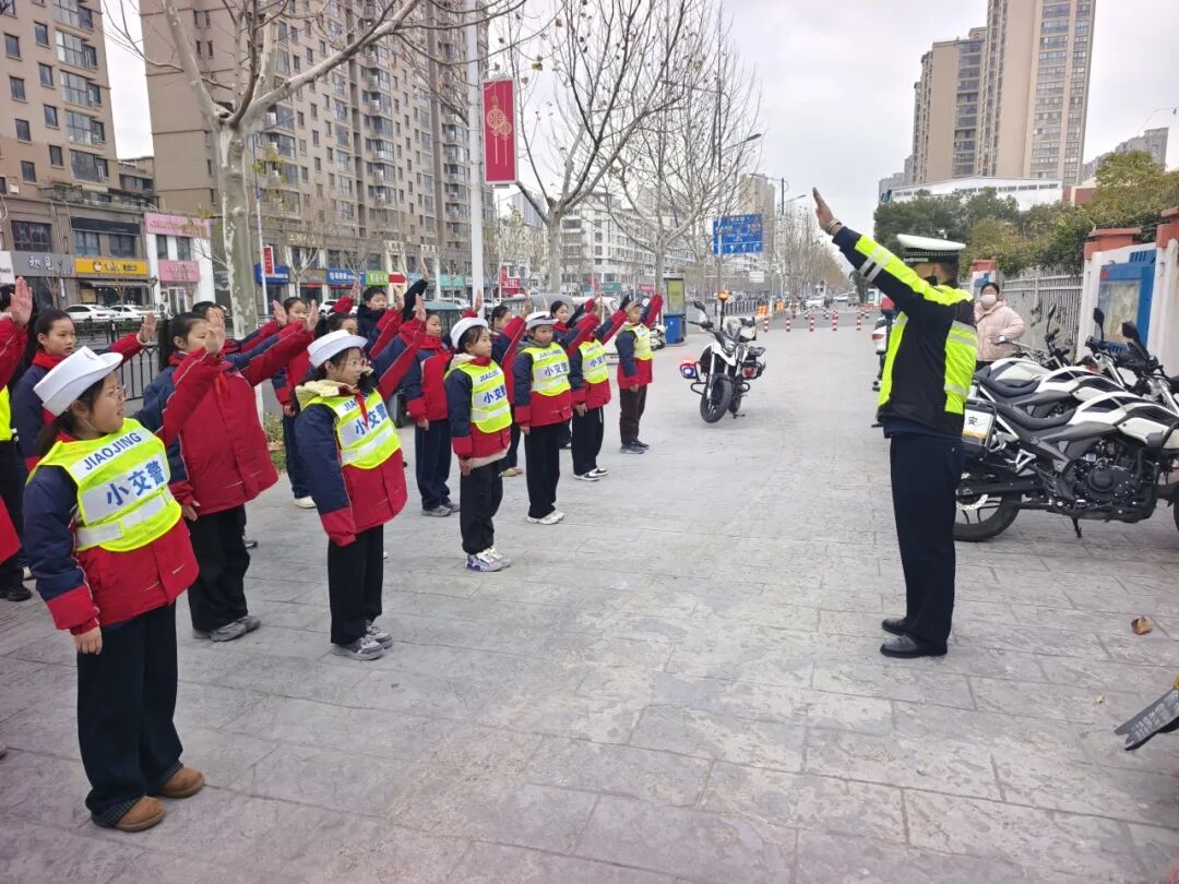 为了让队员们更好地掌握交通规则,民警结合小学生的日常出行场景,开展了一场生动有趣的交通安全互动课堂。通过情景模拟“过马路”“乘坐交通工具”,问答互动“红灯停还是绿灯停?”“过马路要走什么线?”,以及现场指导交通疏导手势等形式,把枯燥的交通规则变得通俗易懂、趣味十足。