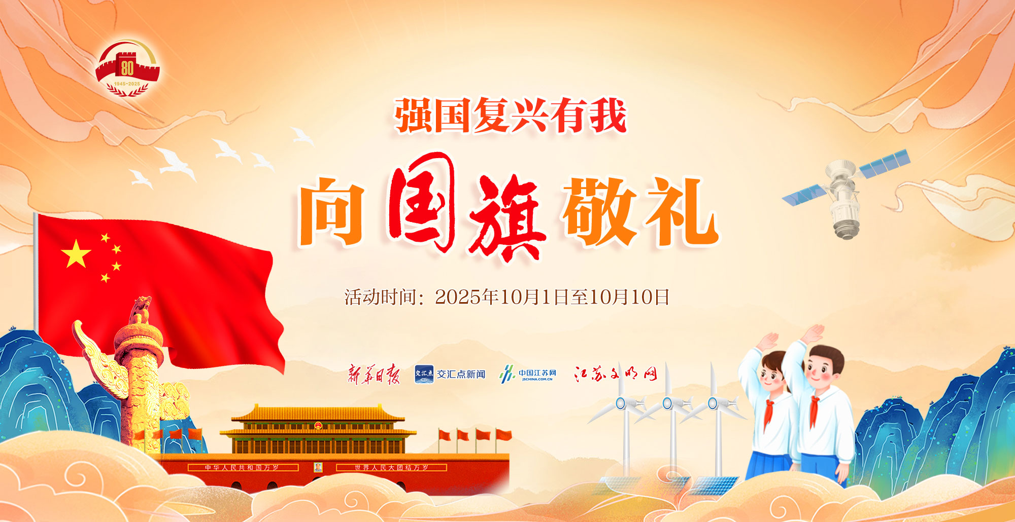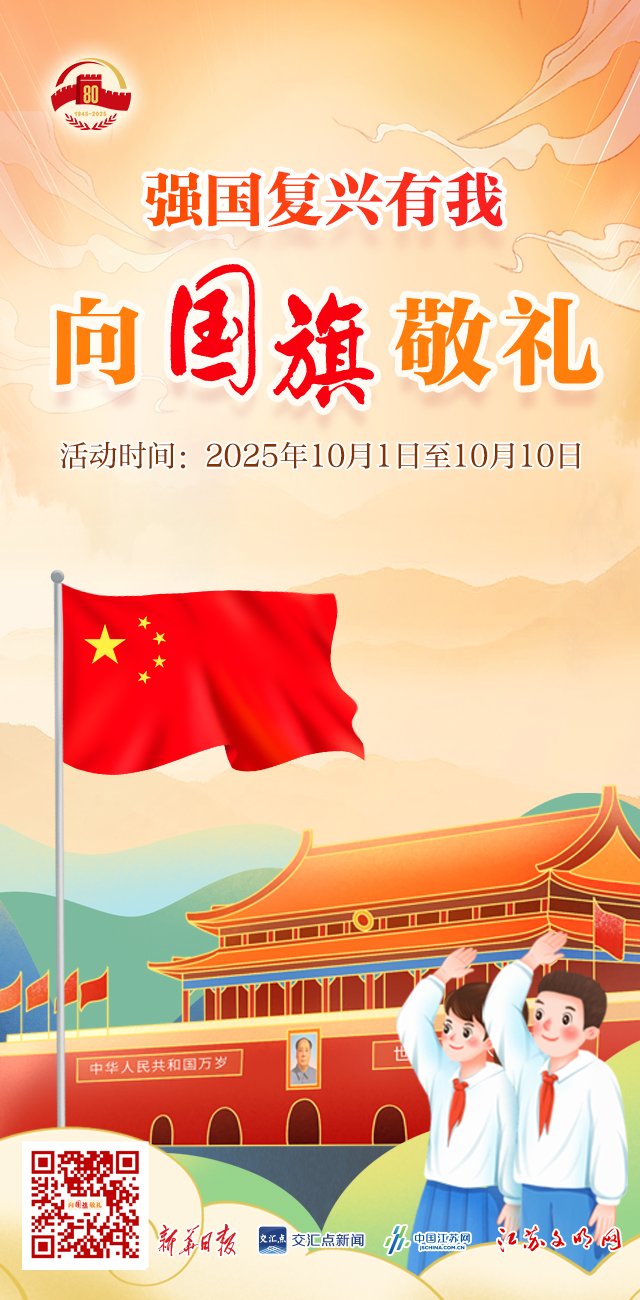 今年是中国人民抗日战争暨世界反法西斯战争胜利80周年。为引导广大青少年弘扬伟大抗战精神、传承红色基因,江苏文明网特别策划2025年江苏省青少年“向国旗敬礼”活动,欢迎广大青少年朋友踊跃参与,向鲜艳的五星红旗敬礼,向伟大的祖国祝福。
