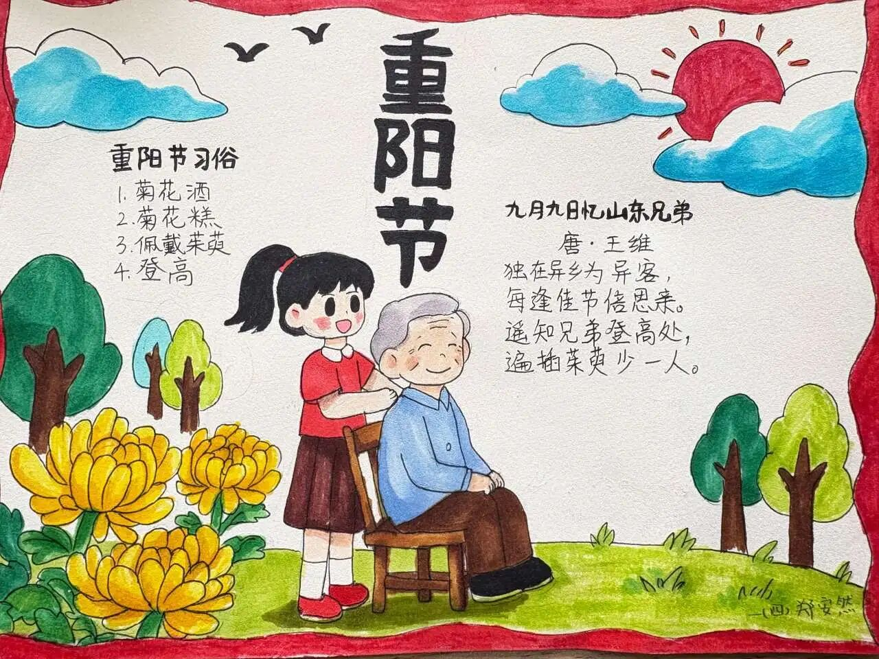 一、二年级开展“我心中的重阳节”绘画活动。学生结合对重阳节的了解,画出与爷爷奶奶一起吃重阳糕、陪外公外婆赏菊、给长辈捶背等场景。