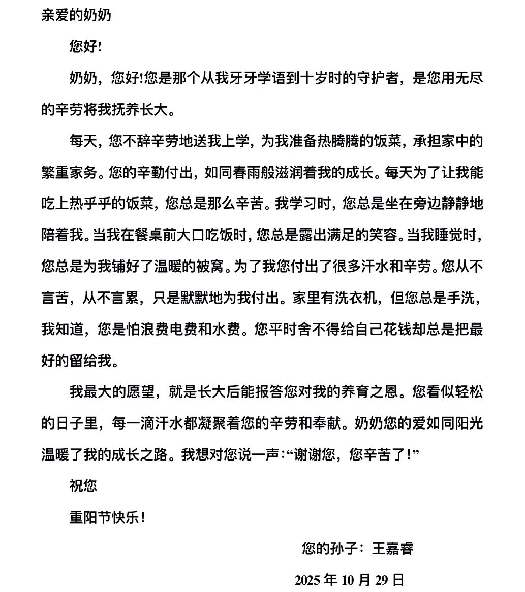 三、四年级举办“重阳感恩书信”征文活动。学生以书信的形式写下对爷爷奶奶、外公外婆,或是父母的真挚心声。有的回忆成长中长辈悉心照料的点滴细节,有的写下藏在心底的祝福与成长的承诺。让这一字一句,成为亲情的温柔纽带;用最真诚的语言,传递不曾轻易说出的爱。