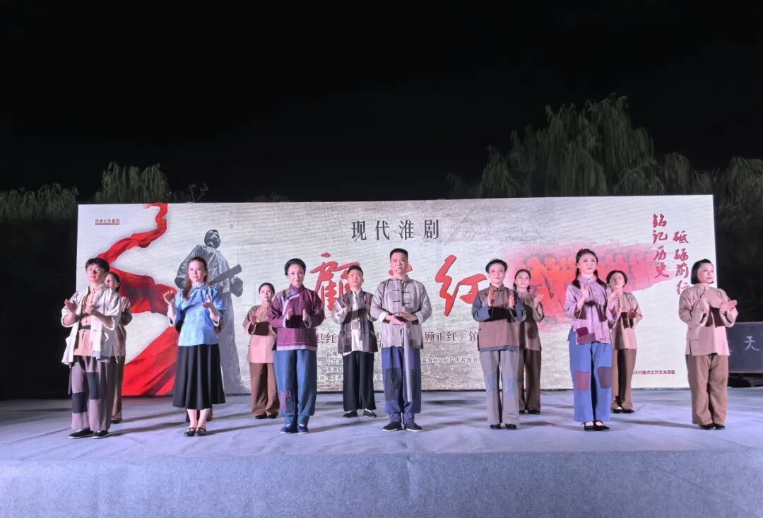 射阳县吾悦广场的红色纳凉晚会上,宣讲员讲述着“文抗”先辈以笔为枪的故事,台下观众听得入神,红色知识抢答时大家举着手喊答案。黄沙港镇泊心广场上,川剧变脸演员手袖一甩就换张脸谱,引得阵阵惊呼,《鱼虾满仓幸福来》的舞蹈跳着渔港丰收的喜庆。海河镇孩子蘸着颜料在扇面上拓印,大人跟着做艾草锤。洋马镇灯光球场,篮球赛正打得火热,夜跑队伍戴着荧光饰件跑过“十里菊香”步道,金菊广场上,村民跳着广场舞,志愿者递来消暑西瓜,晚风里满是欢喜。