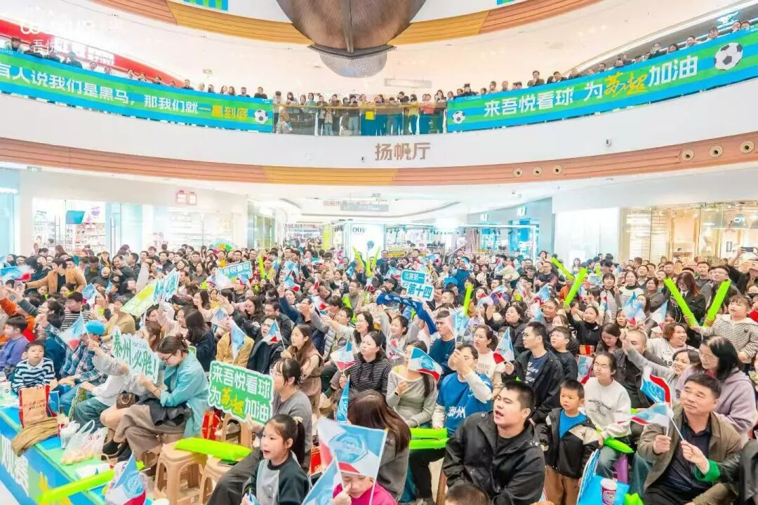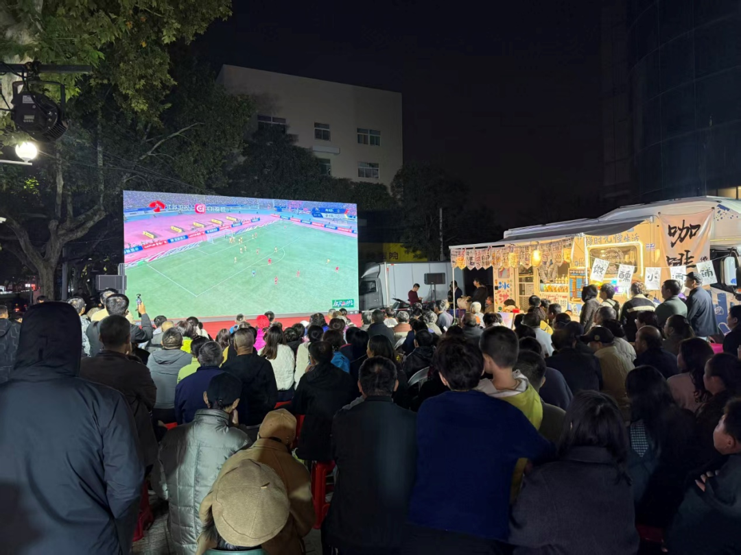 11月1日晚,泰州城中街道文峰大世界新时代文明实践点的“苏超”决赛观赛主会场,化身为激情与欢乐的海洋。广场中央的高清大屏实时转播赛事进程,专业音响系统将赛场欢呼声、裁判哨声清晰传递,让现场球迷仿佛置身南京奥体中心。作为活动潮玩美食中心,集市区人气爆棚,舞台区歌舞表演与颠球PK赛高潮迭起,游戏区欢声笑语不断。商场同步推出“观赛消费券”,持观赛凭证可兑换购物折扣,有效带动客流量,实现观赛热情与消费活力的双向转化。比分竞猜、总进球数预测等互动环节更是人气火爆,答对的球迷可领取定制应援棒、“苏超”主题纪念品,现场欢呼声此起彼伏。美食、福利与互动,为泰州队打造了一个响亮的助威第二现场!