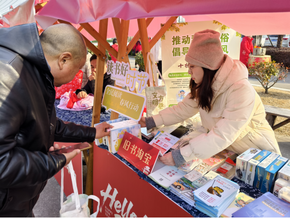 舞台上,歌声飞扬,舞姿动人,精彩纷呈的节目吸引了大量游客驻足欣赏。舞台下,一场融合全民阅读推广与文明实践的“文化市集”同步展开,“旧书淘宝”摊位格外热闹,现场不少村民携书前来,以书会友,让闲置书籍在流转中重获“新生”。此外,“书香方巷”“文明方巷”主题文化袋、书签、文具广受欢迎,全民阅读推广手册、“扫黄打非”科普手册及网络安全知识折页等正被有序分发,文明理念悄然传递。