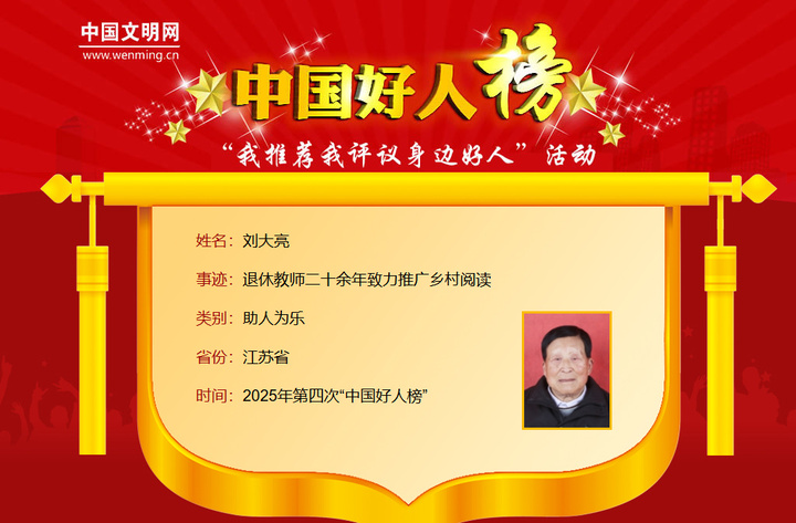 刘大亮,男,1944年9月生,中共党员,江苏省淮安市淮阴区刘河村村民。他本是一名普通的乡村退休教师,却怀揣“集报育人”的初心,二十余年来奔走全国各地,自费收藏党报党刊二十余万份,并将珍贵藏品无偿捐赠给家乡刘河村,助力建成“红色读书角”。他主动担任义务讲解员,累计接待群众上万人次。他发起“情暖童心 爱佑成长”阅读关爱行动,组建全民阅读推广志愿者队伍,为困难群体送去定制化的阅读关怀。刘大亮曾荣获“全国乡村阅读推广人”等荣誉。
