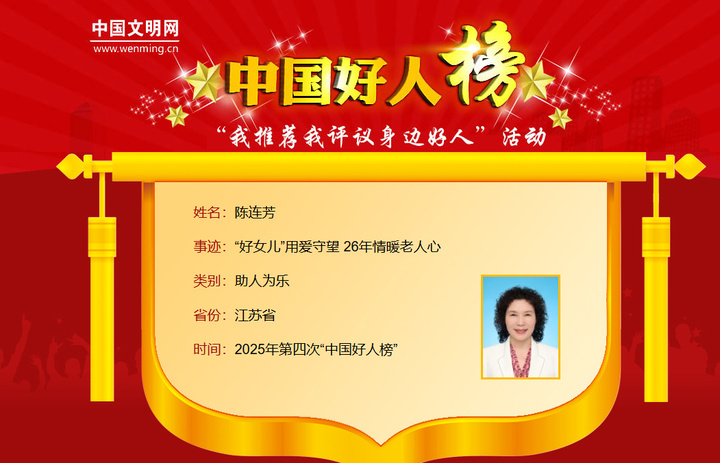 陈连芳,女,1965年1月生,中共党员,江苏省盐城市大丰区草堰镇“心连心”志愿服务队负责人。从2000年春节前夕第一次走进草堰敬老院开始,陈连芳每年都会带着慰问品来到敬老院探望慰问,像“亲闺女”一样温暖呵护着这里300多名孤寡老人。为了汇聚更多的爱心,2014年,她发起成立“心连心”志愿服务队,多年来奔走乡间,为遭遇困境的乡邻伸以援手、为出行不便的村民亮灯筑桥修路、先后带领志愿团队走访帮扶140余名困境儿童,用平凡坚守书写小镇大爱的暖心故事。陈连芳曾荣获“江苏好人”“江苏省三八红旗手”等荣誉。