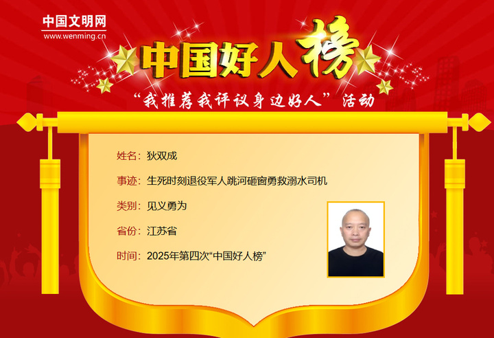 狄双成,男,1985年2月生,江苏省泰州市海陵区九龙镇龙江社区居民。狄双成早年应征入伍,退役后依然保持着军人的责任感与热心肠。2025年10月14日,面对掉入河中迅速下沉的车辆,狄双成凭借过人的智慧和胆识,用石头砸开汽车天窗,不顾手臂流血,迅速将溺水司机拖拽出来。