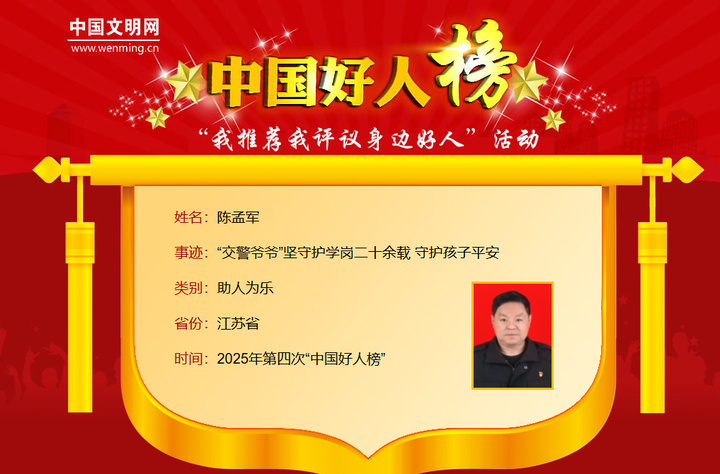 陈孟军,男,1954年9月生,中共党员,江苏省徐州市公安交警支队退休干部。陈孟军在工作生活中始终以雷锋同志为榜样,在职期间创建了8个小学护学岗,并率先垂范,每天早晚交通高峰时段坚持到护学岗执勤。2014年退休以来,他依然坚守在徐州市解放路小学护学岗,维护秩序、指路导向、扶老携幼。他还资助了3名生活困难的学生、受聘为9所学校的交通法治副校长,开展义务讲座近百场,被同学们亲切地称为“交警爷爷”。