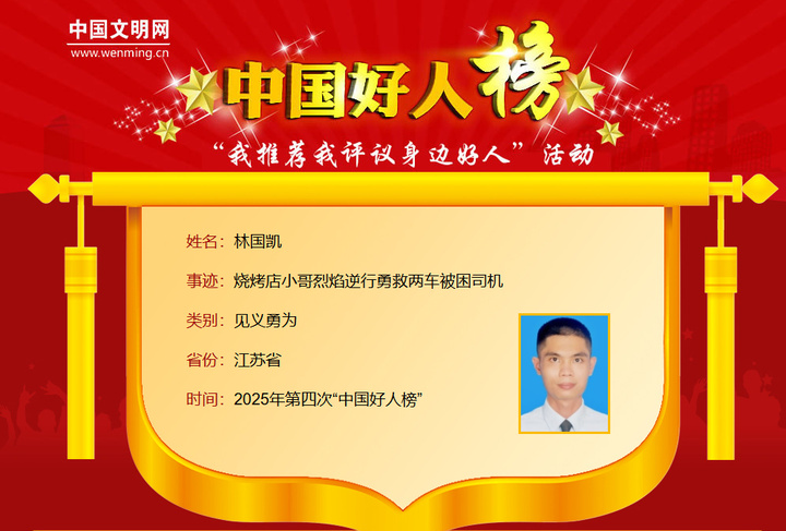 林国凯,男,1991年5月生,江苏省南京市鼓楼区某烧烤店工作人员。2025年9月,南京市栖霞大道快速路上发生一起两车碰撞事故,火势一触即发。危急关头,驾车途经的林国凯迅速靠边停车,冲向事故车辆,冒着生命危险徒手从破窗中拖拽出前车被困驾驶员,又协助后车怀孕司机疏散至安全地带。林国凯曾荣获江苏省见义勇为专项奖励。