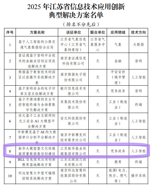 省工信厅、省委网信办、省国家密码管理局近日联合发布2025年江苏省信息技术应用创新典型解决方案名单,由新华报业传媒集团(以下简称“新华报业”)申报的“新华大模型暨文化传媒高质量数据集信创建设”方案成功入围。据悉,作为全省首个文化传媒领域入选的信息技术应用创新解决方案,标志着江苏文化传媒行业信创转型迈入标准化、规模化发展新阶段。