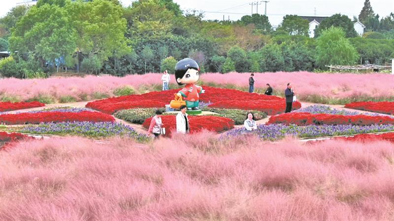 走进蒲市村,美学元素藏在处处细节里。不远处的蒲市里,大片粉黛花海随风摇曳。“这片粉黛花田总面积约7.5亩,中心设计为五角星形态,内部种植四季草花,以红色、紫色为主。粉黛乱子草9月底开始呈现粉色,观赏期可持续至11月中旬。”蒲市村村委会副主任李强说,这片粉黛花田最近人气很旺,周末的客流量在1000到1500人。花海旁,老厂房改造的咖啡馆飘出醇厚香气,隔壁农家书屋内,翻书声与窗外鸟鸣声相交织。沿着木栈道往池塘方向走,白墙黛瓦的江南民居倒映在清澈水面,岸边垂柳与芦苇轻晃,游客们或在花丛中拍照打卡,或参观新四军六师师部驻地旧址,或点一杯“村咖”感受返璞归真的自然氛围。