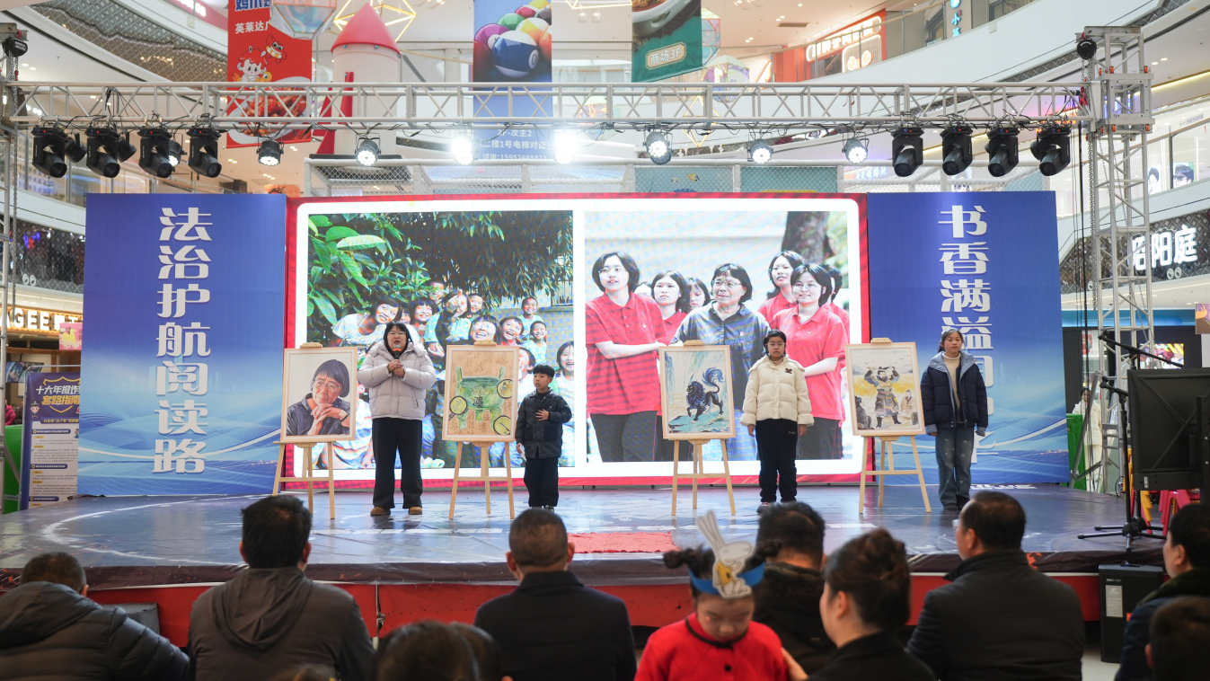 同阅读、共分享,阅读分享环节中,读书心得分享、学法用法故事宣讲、情景绘本演绎《一只聪明的笨狼》等轮番上演,优秀画作赏析与经典诵读表演穿插其中,营造出“墨香满庭、法韵悠长”的浓厚氛围。互动环节中,两场《全民阅读促进条例》知识有奖竞答引得现场读者踊跃参与;“书香法韵”模范家庭聘任仪式上,模范家庭受聘“上岗”,将以各自家庭的浓郁读书氛围带动更多的人捧起书本,共沐书香,推动“普法+阅读”理念深入人心。