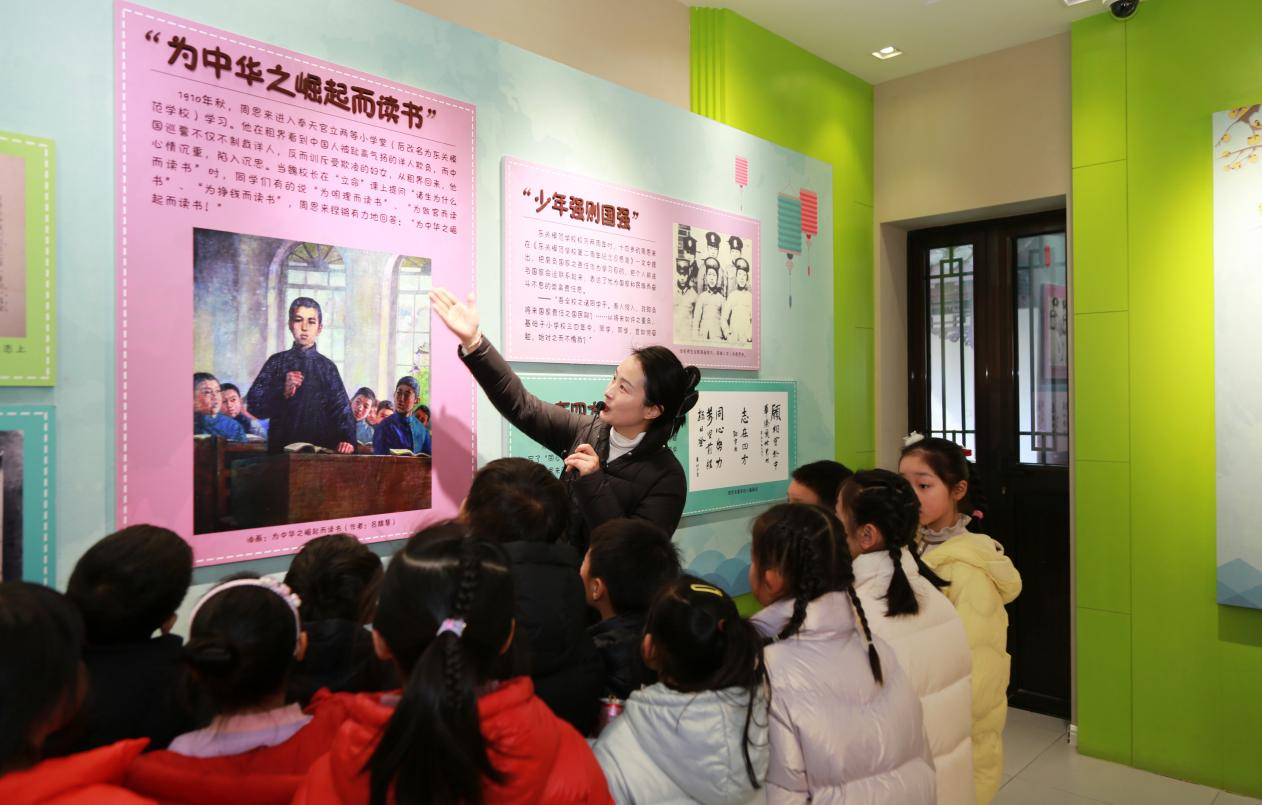 在讲解员老师的带领下,同学们有序参观,聆听周恩来总理少年时期读书的故事。