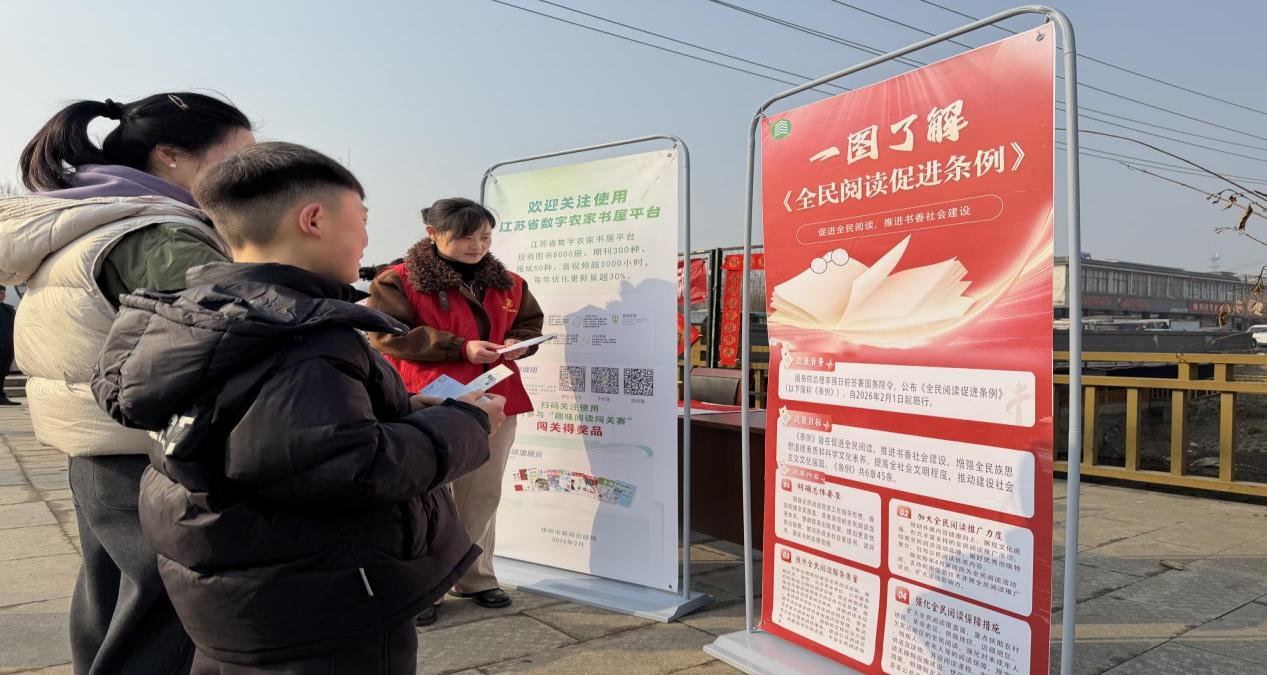 在时集镇主会场,3名中小学学生代表依次登台,结合自身阅读经历畅谈成长感悟,真挚的情感中激荡着少年读书的热忱;2名乡镇读书达人分享阅读习惯、推荐优质书目,以身边故事带动群众让书香融入日常。紧接着,工作人员将书包、文具等学习用品送到学生代表手中,并亲切询问孩子们的阅读与学习需求。“收到这份新年礼物特别开心,我要好好读书。”捧着崭新的书包,孩子眼中闪烁着喜悦的光芒。随后,大家来到全民阅读宣传展区,工作人员以通俗易懂的语言讲解不良出版物和网络有害信息的危害,普及数字农家书屋的使用方法,并组织领学《全民阅读促进条例》核心内容,引导群众知悉阅读权利、履行阅读义务。