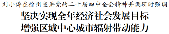 10月28日至29日,省长刘小涛在徐州市宣讲党的二十届四中全会精神并调研。他强调,要学习好贯彻好党的二十届四中全会精神,自觉把思想和行动统一到习近平总书记重要讲话精神和全会部署上来,以推动高质量发展为主题,更有针对性地稳就业、稳企业、稳市场、稳预期,坚决实现全年经济社会发展目标,着力增强区域中心城市发展能级和辐射带动能力,为全国全省发展大局多作贡献。