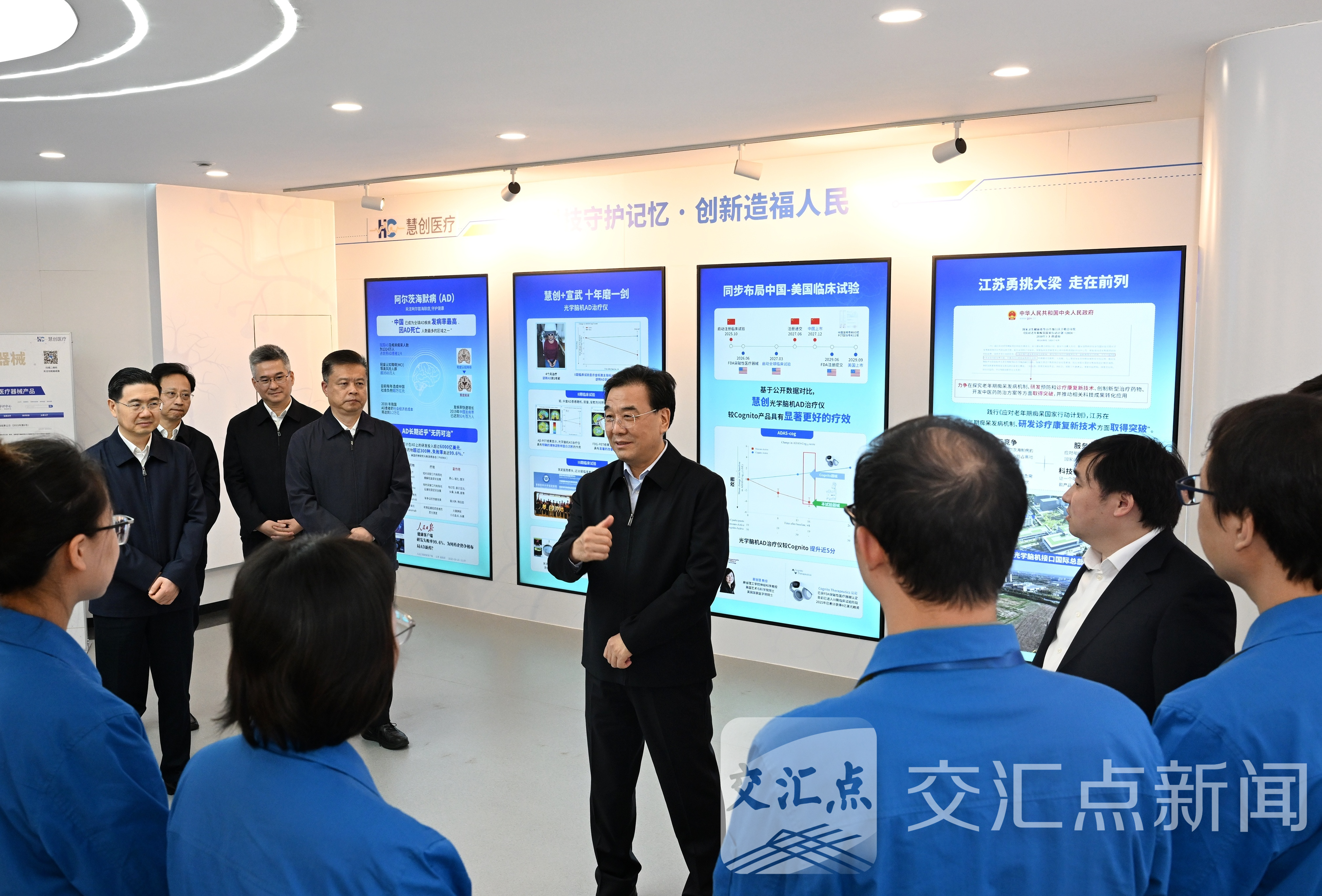 慧创医疗公司专注于脑科学领域的研究探索。在展厅,信长星听取企业发展历程、产品技术原理及临床试验等情况介绍,与科研人员深入交流。他指出,推动高质量发展,最重要的是加快高水平科技自立自强。中央《建议》明确了“十五五”时期“科技自立自强水平大幅提高”的战略目标,并专门就脑机接口发展作出部署,这将为企业发展带来重大机遇。希望大家扎根江苏、深耕江苏,在前沿技术领域大胆探索、持续攻关,更好地为人民群众生命健康服务。省市有关部门要主动靠前,及时帮助解决实际困难,助力企业发展壮大。