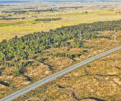 “十四五”时期,“三北”工程攻坚战取得阶段性成效。图为内蒙古库布其沙漠北缘锁边林带。