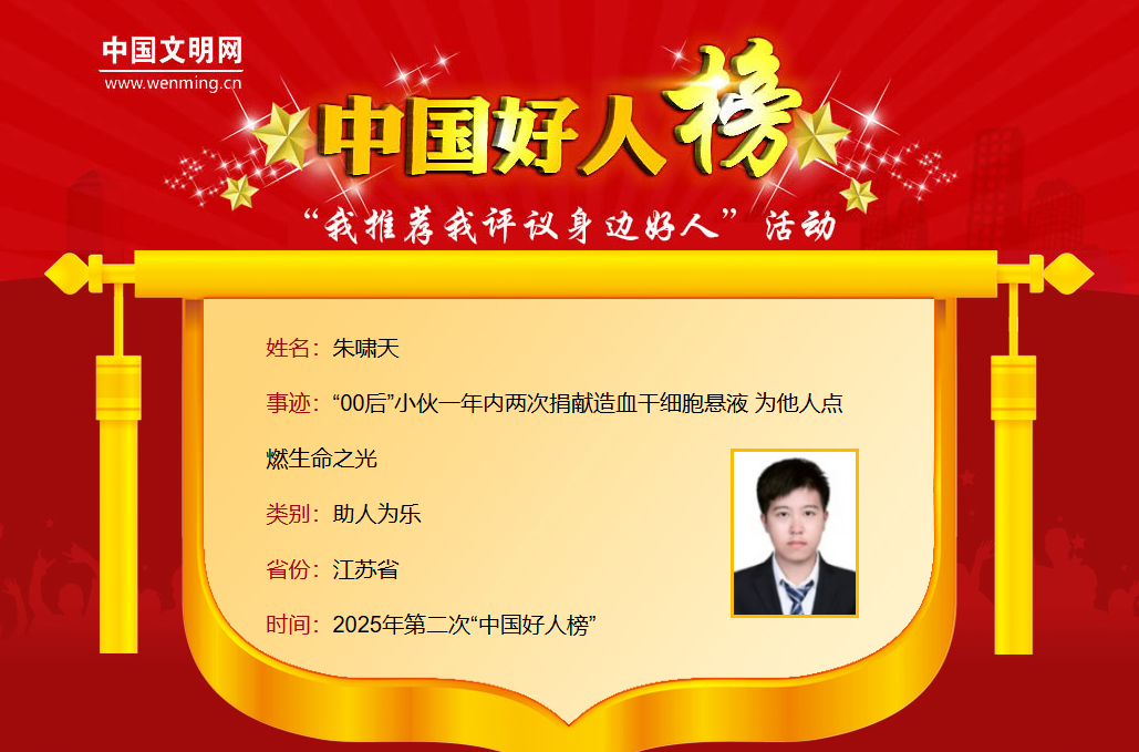 朱啸天,男,2000年5月生,中共党员,江苏省金湖县人民法院法官助理。2024年4月,朱啸天为一名陌生的血液病患者捐献造血干细胞悬液227毫升。2025年3月,他再次为该患者捐献造血干细胞悬液226毫升,又一次为患者带去了生的希望。