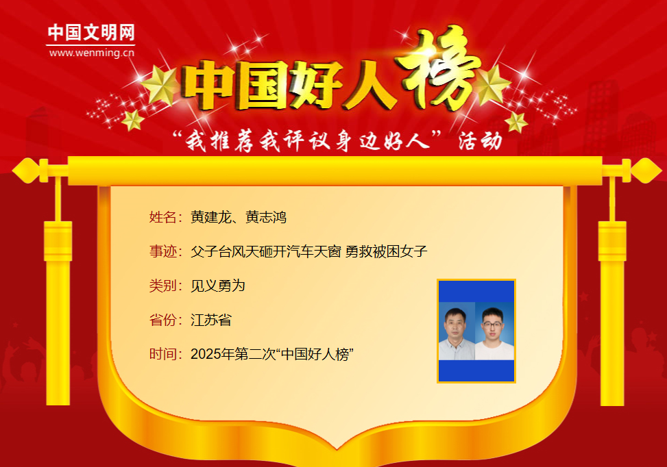黄建龙,男,1976年8月生;黄志鸿,男,2001年8月生,二人均为江苏省江阴市徐霞客镇红星村村民。2024年9月16日,黄建龙、黄志鸿父子不顾自身安危,成功砸开一辆落水轿车的天窗,将一位呼吸暂停的女子成功救出。在过路行人的合力救助下,黄建龙、黄志鸿父子及时把该女子送往医院,为抢救赢得了宝贵时间。