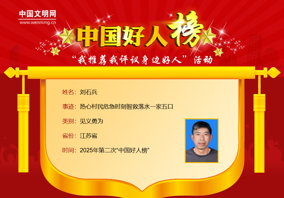 刘石兵,男,1968年9月生,江苏省泰州医药高新区(高港区)胡庄镇刘荡村村民。2025年2月11日,56岁的刘石兵凭借冷静的判断与过人的勇气,从即将沉没的轿车中救出一家5口,用实际行动诠释见义勇为的精神内涵,展现了平凡人的英雄本色。刘石兵曾荣登“江苏省见义勇为勇士榜”等荣誉。