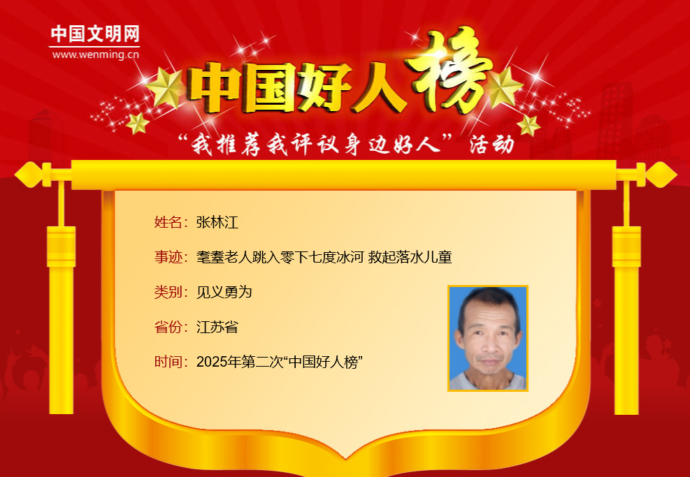 张林江,男,1941年11月生,江苏省南通市海门区四甲镇金跃村村民。2025年2月9日,气温降到了-7℃,一名孩子在冰面上玩耍时不慎掉入冰河。张林江看见后毫不犹豫跳入河中,以耄耋之躯救起9岁落水儿童。