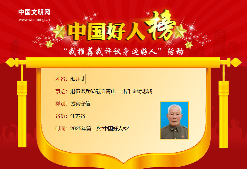 颜井武,男,1933年12月生,中共党员,江苏省连云港市云台山景区南云台林场退休职工。从1957年立下绿化荒山的誓言开始,颜井武就把家搬进了深山,将自己与大山连接在了一起。年轻时,他带着工人们植树造林、改造荒山,退休后依然执着无偿守护山林。63载的坚守,从青丝到白发,他用执着信念谱写出一曲守信践诺的感人诗篇。颜井武曾荣获全国最美护林员、“江苏好人”等荣誉。